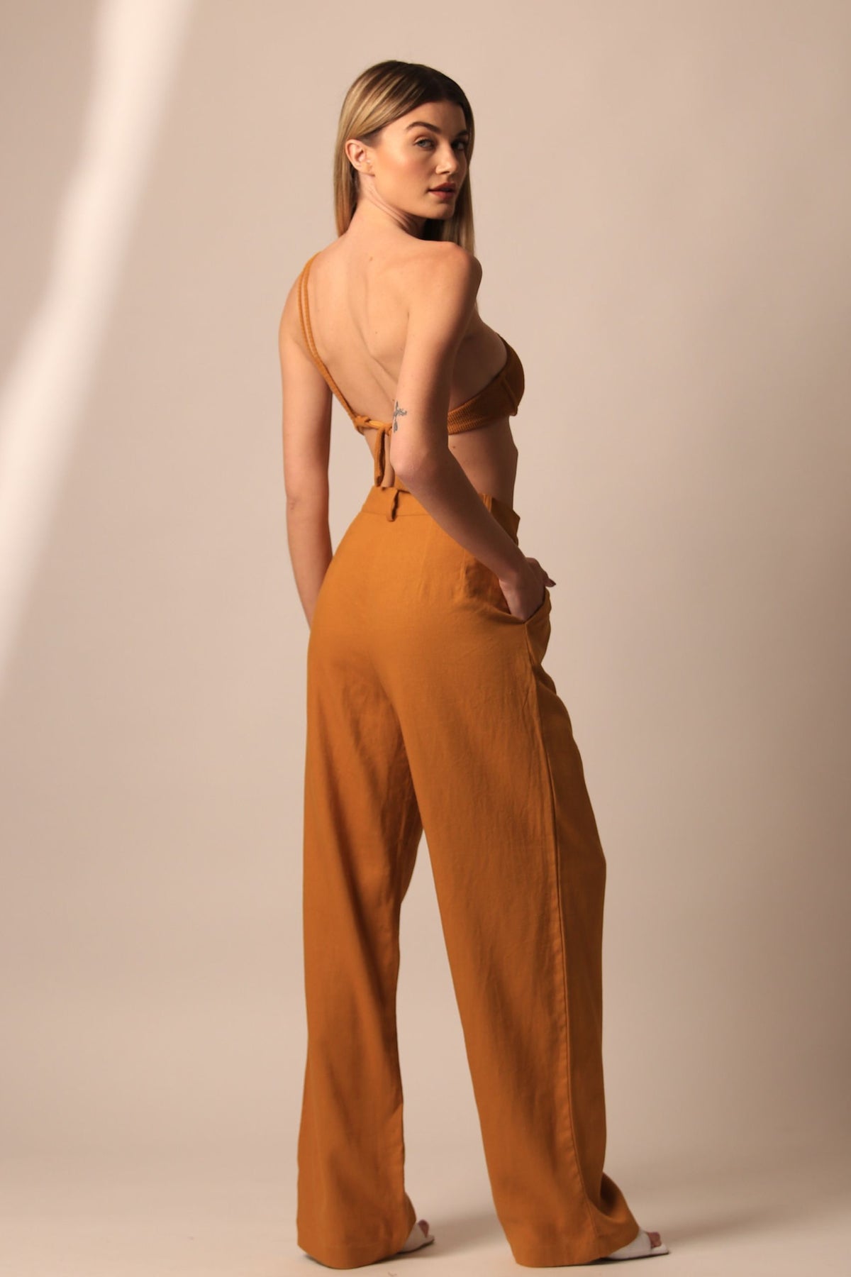 A calça com modelagem reta e super confortável, com cintura marcada e caimento soltinho. A peça foi desenvolvida em tecido de linho. De cintura alta, fechos embutidos e pences nas costas, modelando bem. É perfeita para curtir o verão com muita sofisticação.