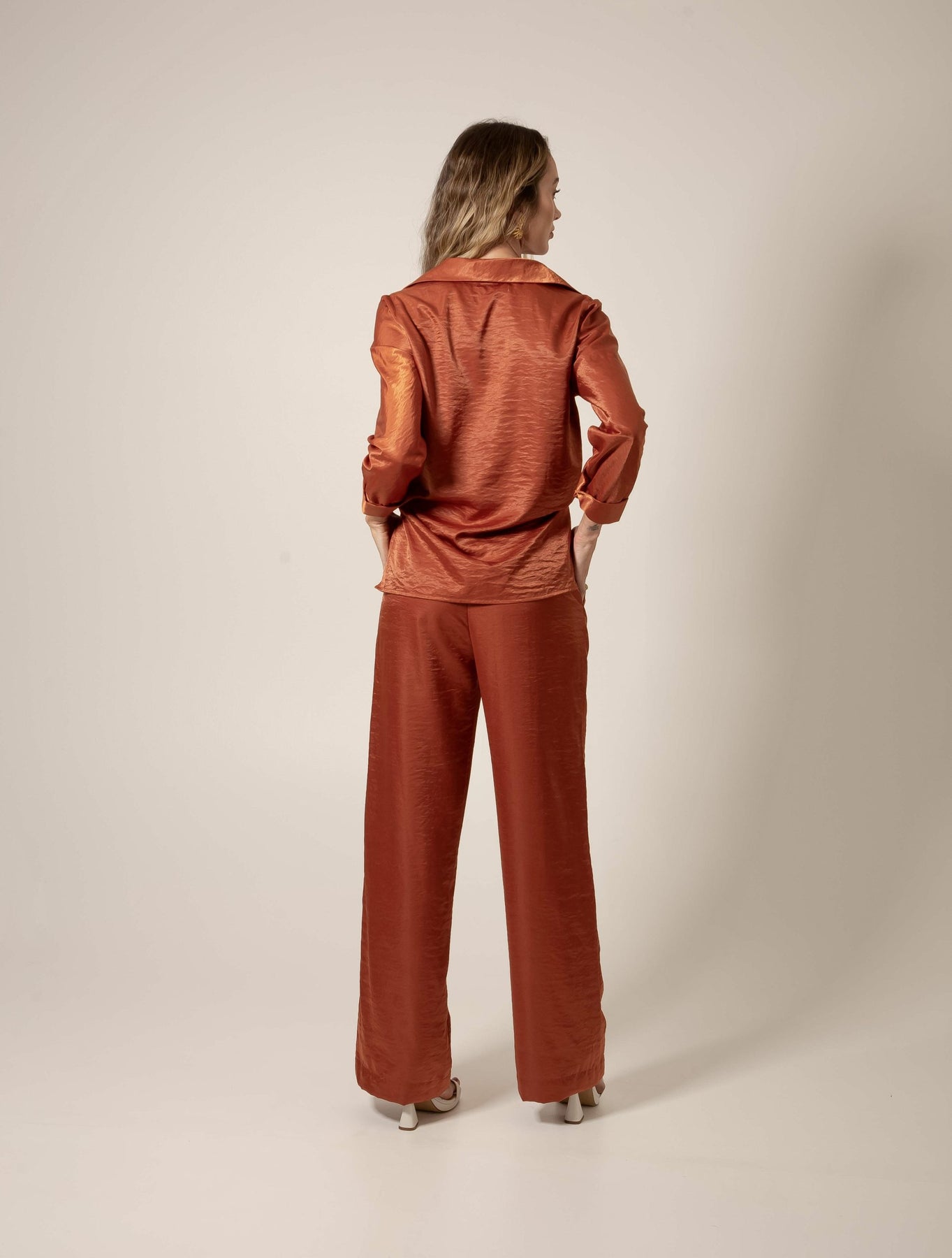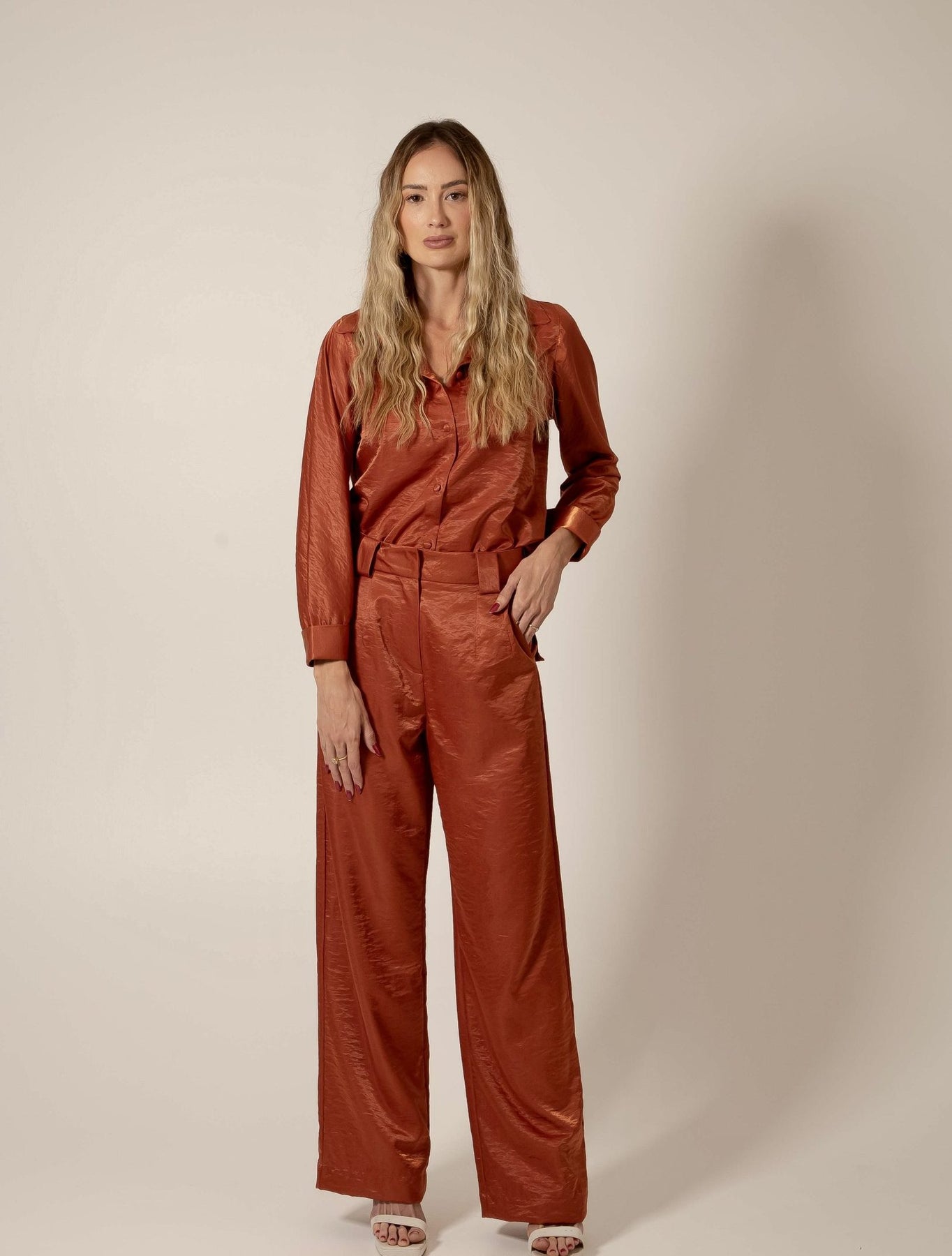A calça Oriente feita de tecido levemente acetinado, é uma peça que irradia sofisticação e elegância. O toque especial do tecido acetinado eleva seu charme, enquanto os botões cobertos no mesmo tom adicionam um refinamento sutil, mantendo a harmonia e o encanto da peça.