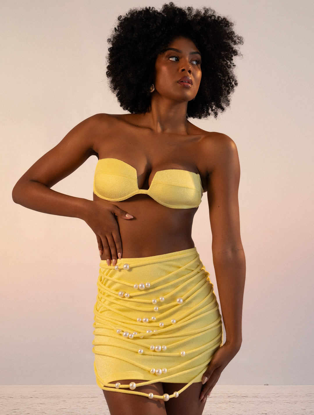 O grande destaque fica por conta das tiras adornadas com pérolas, um detalhe artesanal que transforma a saia em um item exclusivo da Sun Rose. Seu comprimento ideal garante conforto e fluidez, permitindo composições que vão do beach ao resort com facilidade.