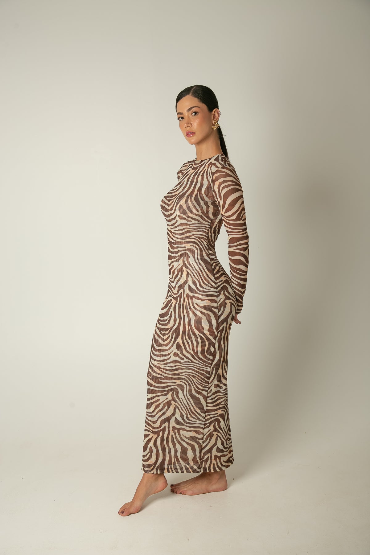 O Vestido Jacarandá traz uma leitura elegante e contemporânea da estampa animal print. Feito em tule com elastano e dupla camada de tecido, oferece caimento leve, conforto e segurança ao vestir. A modelagem longa, com mangas compridas e decote alto na frente, equilibra sofisticação e presença.