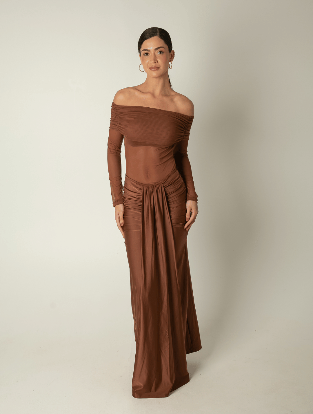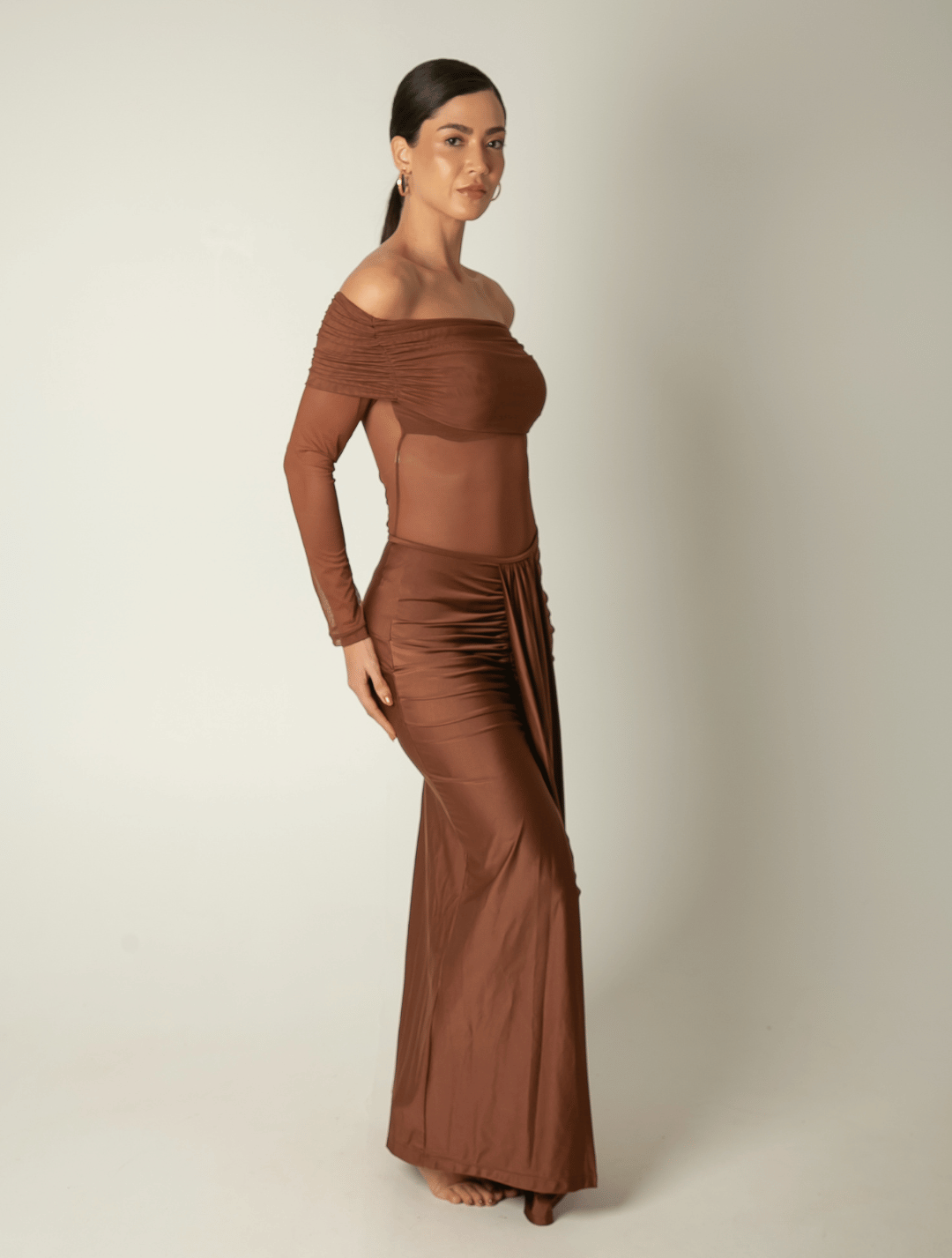 A Blusa Gália traz leveza e sofisticação com design versátil e contemporâneo. Feita em tule de poliamida de alta tecnologia, possui drapeados no ombro e mangas que adicionam movimento e elegância à silhueta. O forró na região do busto garante conforto e evita transparência, mantendo o equilíbrio entre delicadeza e usabilidade. Na cor Cacau — um tom marrom atemporal — é a escolha perfeita para composições que transitam com naturalidade entre o dia e a noite.