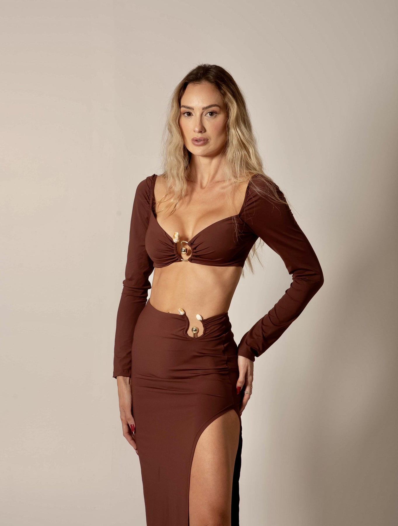 Moderna e autêntica a saia Midi com acessório orgânico é a peça ideal para quem procura versatilidade, podendo ser usada em varias ocasiões. A parte da frente possui adorno feito em metal banhado a ouro e pedra marmorizada, que trazem um estilo único a peca, além de possui fenda em formato orgânico e moderno, trazendo um estilo único à peça.