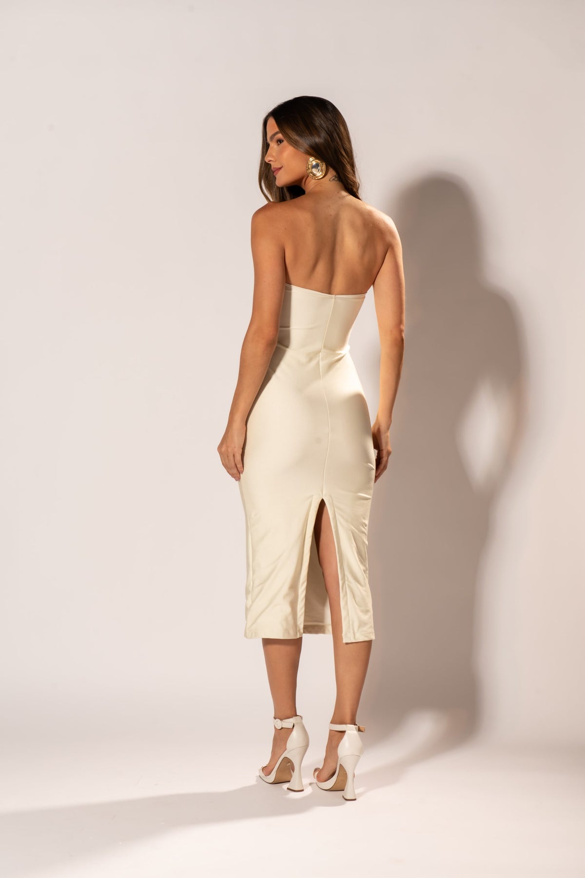 Com forro duplo, evita transparências indesejadas, enquanto o franzido suave na cintura proporciona um caimento impecável, valorizando a silhueta e disfarçando marcas. A parte inferior, com uma leve abertura, cria um efeito sereia que realça as curvas com sofisticação. O adorno orgânico banhado a ouro é o detalhe que transforma o vestido em uma verdadeira obra de arte.